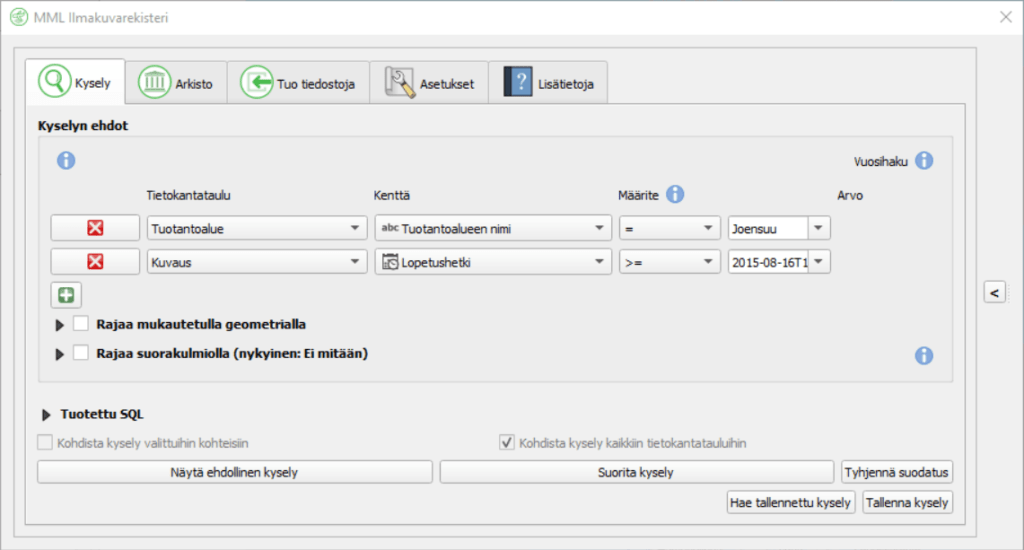 Ennen nykyisiä järjestelmiä ilmakuvien metatietoa hallinnoitiin Oracle-tietokannassa Visual Basic -pohjaisella järjestelmällä, jonka haasteina olivat tallennetun tiedon hajanaisuus, sovelluksen ikääntyminen sekä puutteellinen käytettävyys. Laserkeilausaineistoja puolestaan hallinnoitiin ESRI-pohjaisella ratkaisulla. Molemmissa järjestelmissä tietokanta piti sisällään sekä yksityiskohtaista metatietoa että tuotannonohjaukseen liittyvää tietoa, mikä teki niistä monimutkaisia ja hankaloitti käyttöä. Vuosina 2019-2023 käyttöön otetut uudet, QGIS-käyttöliittymällä hallinnoidut ilmakuvarekisteri ja laserpistepilvirekisteri keskittyvät vain metatietoon.