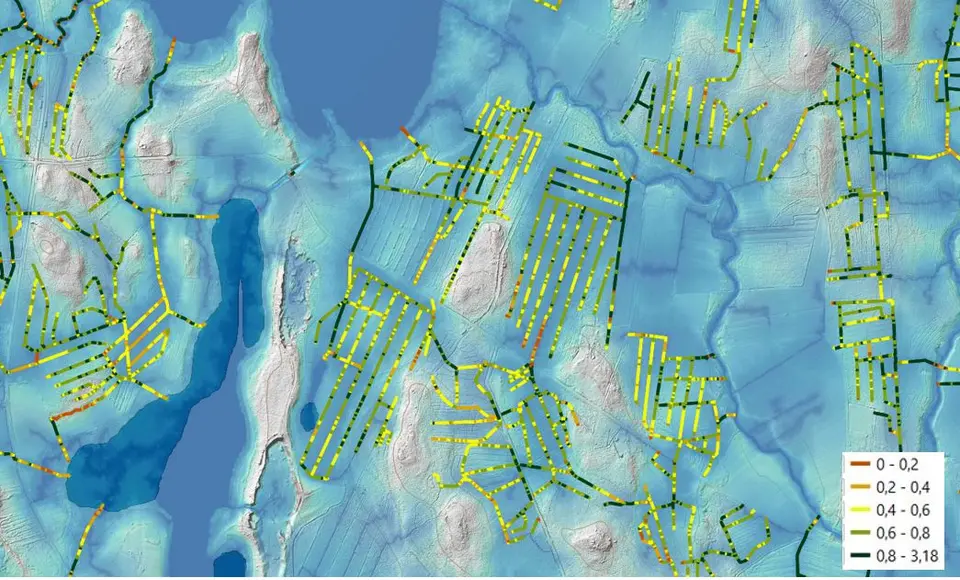 Arbonaut Oy:n kehittämä ojien kuivavara-analyysi on kustannustehokas työkalu suometsien hoitohankkeiden suunnitteluun. Tiheäpulssiseen laserkeilausaineistoon pohjautuva ojien kuivavara-analyysi kuvaa ojan vedenpinnan ja maanpinnan välistä erotusta eli kuivavaraa.