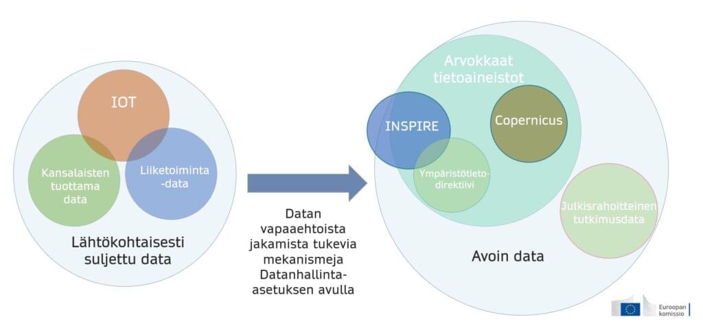 EU luo datatalouden pelisääntöjä digisäädöksillä, kuten Avoimen datan direktiivin arvokkaat tietoaineistot, Datanhallinta-asetus ja tammikuussa 2024 julkaistu Datasäädös. Datanhallinta-asetuksen tavoitteena on olla monialainen väline, jolla lisätään luottamusta tiedonvälityspalveluihin ja edistetään datan vapaaehtoista jakamista yritysten ja kansalaisten hyödyksi. Komissio perusti asiantuntijaryhmän, Euroopan datainnovaatiolautakunnan (EDIB), muun muassa jakamaan parhaita käytäntöjä. EDIB:llä on valtuudet ehdottaa suuntaviivoja yhteisille eurooppalaisille data-avaruuksille esimerkiksi unionin ulkopuolelle tehtävien tiedonsiirtojen riittävästä suojasta.