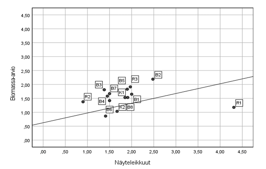 Biomassa-arvion onnistumisprosentti näyteleikkuiden osalta oli 89 prosenttia. Kuvassa 3 havainnollistuu, kuinka vähäiset erot biomassan ja näyteleikkuiden välillä havaittiin, lukuun ottamatta näytepistettä Rapusviken 1. Biomassa-arviot ovat linjassa aikaisempien tutkimusten kanssa. Tässä tutkimuksessa tutkimusalueiden järviruo’on märkäbiomassa vaihteli 4,61-14,3 (t/ha) välillä. Märkäbiomassalta tarkoitetaan biomassaa, johon sisältyy kasvin vesipitoisuus. Keskimääräinen järviruo’on märkäbiomassa koko tutkimusalueella lokakuussa 2020 oli 6,6 tonnia per hehtaari. Niiden lahtien osalta, joista otettiin näyteleikkuita, suurimmat biomassaesiintymät havaittiin Brattnäsvikenin lahdella ja pienimmät Kassorin lahdella.