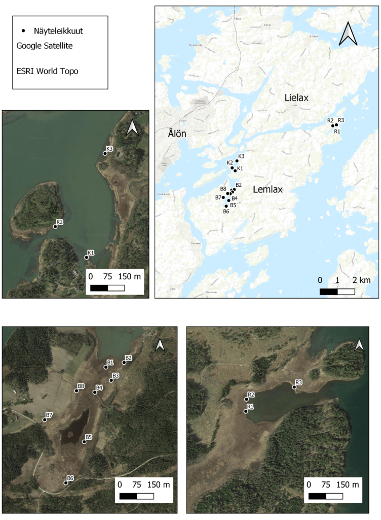 Tutkielmassa käytettiin aineistona European Space Agency:n Sentinel 2 -satelliittikuvia. Kosteikoiden kartoituksen haasteina on multispektraalisten satelliittikuvien suuri spatiaalinen resoluutio, koska vesikasvillisuus muodostaa usein pieniä teräväreunaisia alueita ja isommilla vuorovesikosteikoilla kasvaa useampia lajeja. Monessa aikaisemmassa tutkimuksessa on havaittu, että Sentinel 2 -satelliitin 10 metrin resoluutio soveltuu hyvin vesikasvillisuuden kaukokartoitukseen. Satelliittikuvien lisäksi tutkielmassa käytettiin aineistona kolmen Paraisilla sijaitsevan lahden ruovikoista leikattuja näyteleikkuita. Näyteleikkuita otettiin neljästätoista kohdasta biomassan arviointia varten (kuva 2).