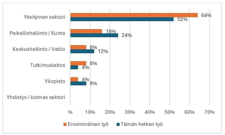 Valmistuneista yli puolet oli töissä yksityisellä sektorilla sekä ensimmäisenä että seuraavana työpaikkana (kuva 2). Jonkin verran liikkuvuutta oli havaittavissa yrityksistä julkiselle sektorille. Tätä tilastoa täytyy tulkita sen valossa, että 43 % vastanneista oli ensimmäisessä työpaikassaan kyselyyn vastaamisen hetkellä, ja 39 % toisessa työpaikassaan. Työuran mediaanipituus kyselyhetkellä oli 4 vuotta. Urien pidentyessä voi olettaa, että liikkuvuuskin lisääntyy.