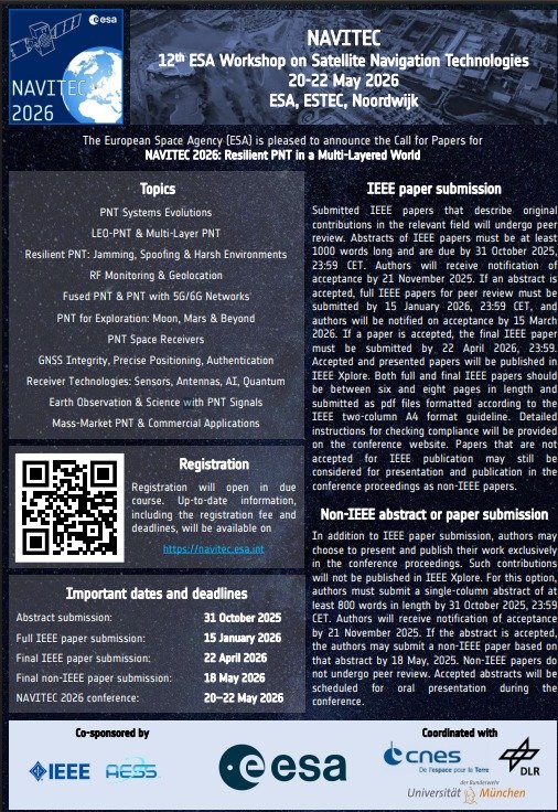 Submit your abstract by 31 October for the 12th edition of this workshop on satellite navigation technologies, which will take place from 20-22 May 2026 at ESA ESTEC in Noordwijk, the Netherlands.