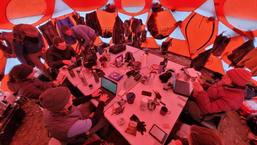 Leirirutiineihin kuuluu vesihuolto ja ruuanlaitto, seuraavien päivien tutkimuskohteiden valinta, töiden ja logistiikan suunnittelu, mittaus- ja havaintoaineistojen tallennus ja käsittely, keskustelut paikoista ja havainnoista, kirjoittaminen, lukeminen, pelaaminen, syöminen, sekä tietenkin yleinen häröily ja hauskuus. Droonien yleistyminen näkyy täälläkin; parhaimmillaan ilmassa oli neljä droonia samanaikaisesti.