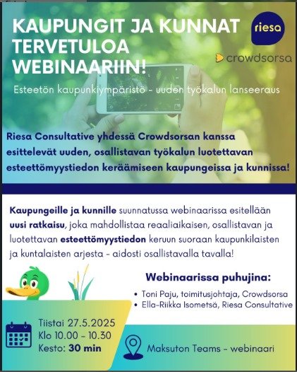 Riesa Consultative Oy yhteistyössä Crowdsorsan kanssa lanseeraavat uuden osallistavan työkalun, joka tuo reaaliaikaisen esteettömyystiedon suoraan kaupunkilaisten ja kuntalaisten arjesta päätöksenteon tueksi.