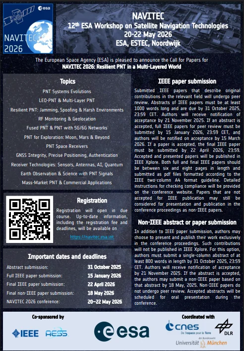 NAVITEC 2026 + Lisää Google-kalenteriin + iCal- / Outlook-vienti Date 20. - 22.05.2026 Time Koko päivä Järjestäjä ESA Jaa tämä tapahtuma
